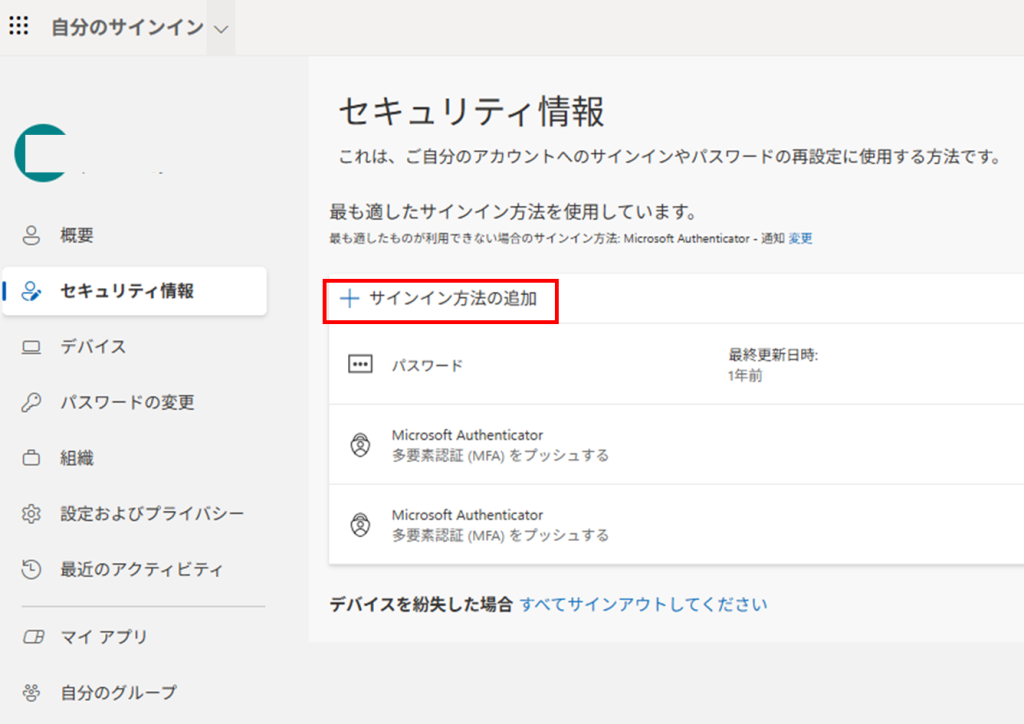 ② セキュリティ情報ページ 上で、「サインイン方法の追加」をクリックします。