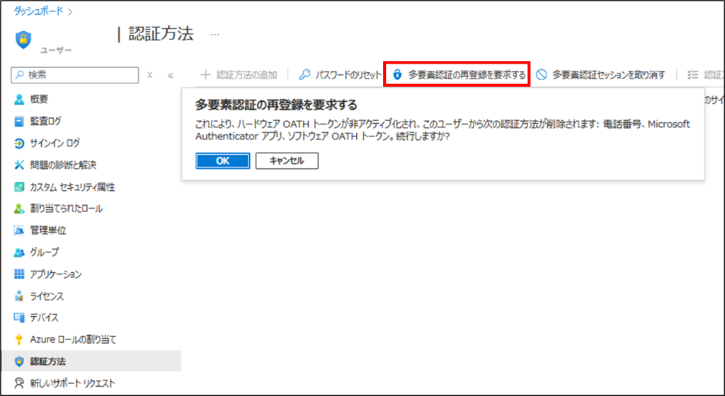 Entraポータルの「ユーザー」→ 該当ユーザー選択(※) → 「認証方法」→ 「多要素認証の再登録を要求」