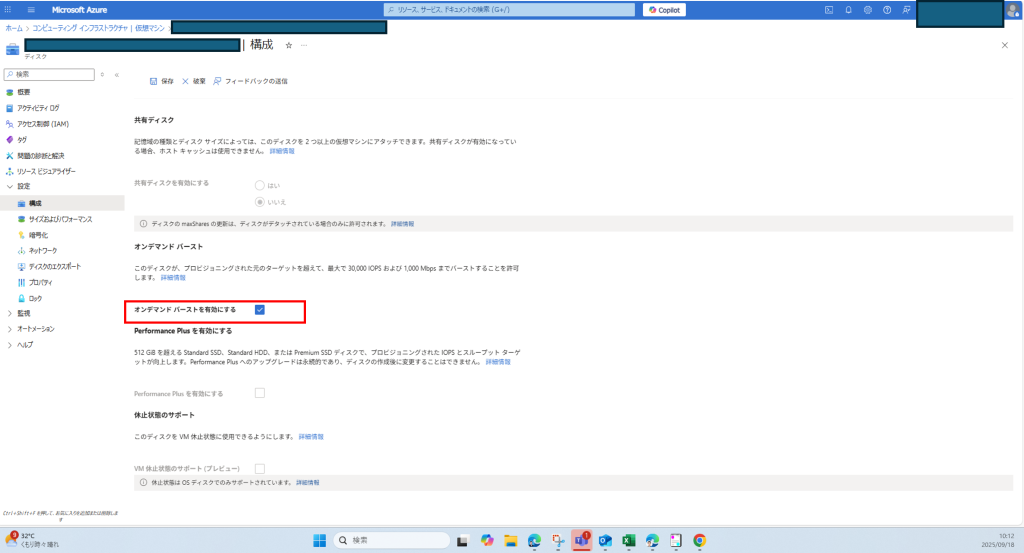 この機能は 513 GiB 以上の Premium SSDで有効にすることができますが、有効にする際はAzure VMからマネージドディスクをデタッチ(取り外し)するか停止(割り当て解除)にする必要があります。