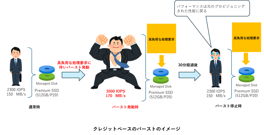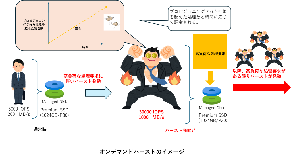 マネージドディスクには”バースト”とよばれる機能があり、マネージドディスクに対して高負荷がかかった際に一時的にプロビジョニングされた性能(IOPSとスループット)を超えてパフォーマンスを発揮することができます。
