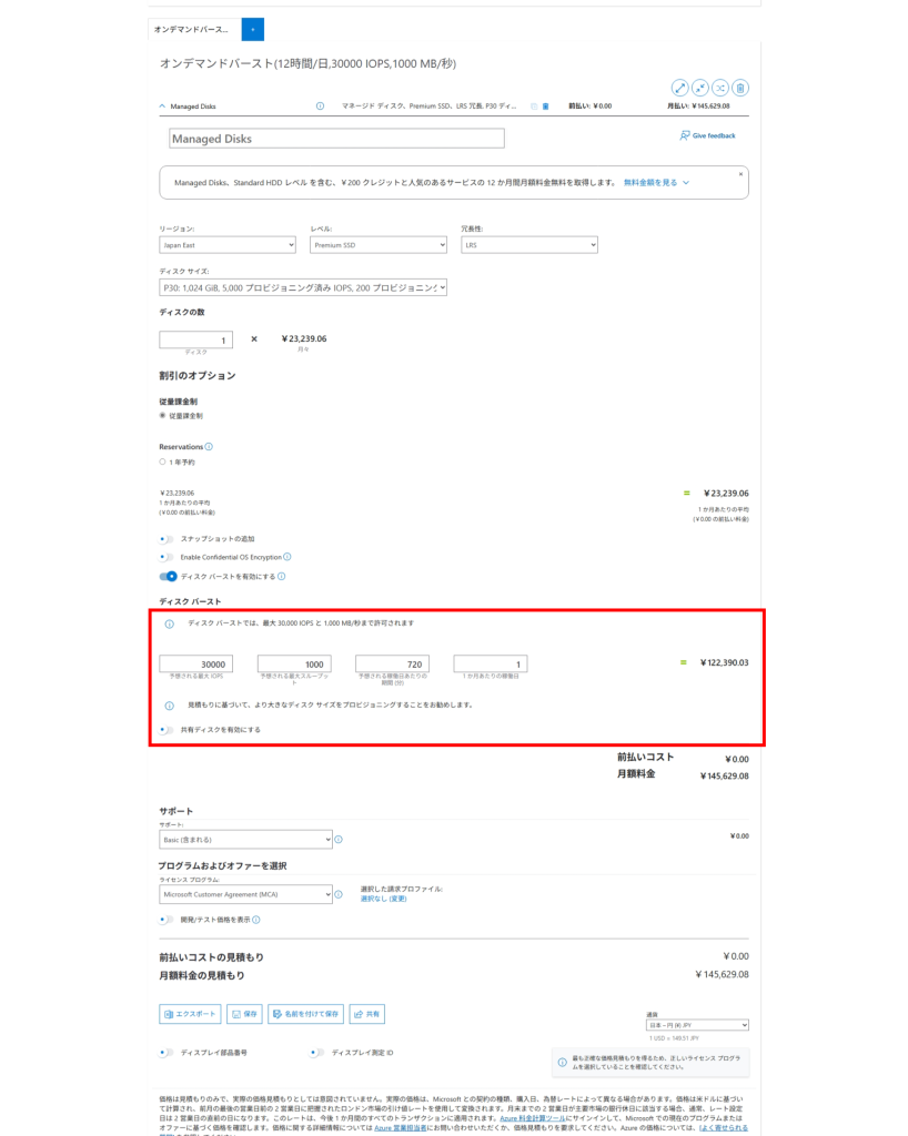 ちなみに以下の見積もり金額はPremium SSD(1024GB/P30)でディスクバーストを有効とし、バースト発生時の予想される最大IOPSを限界値の30000 IOPS,最大スループットを限界値の1000 MB/sとし、それを720分(12時間)処理した際の見積もり金額になります。