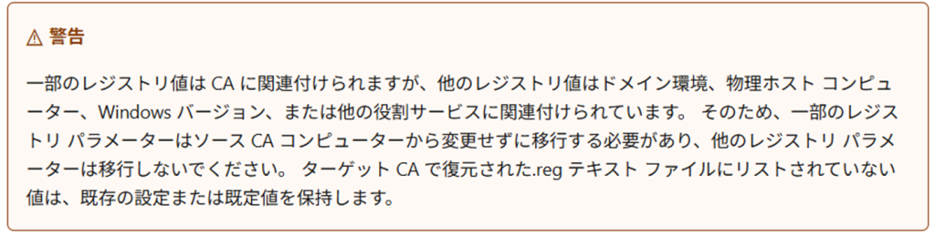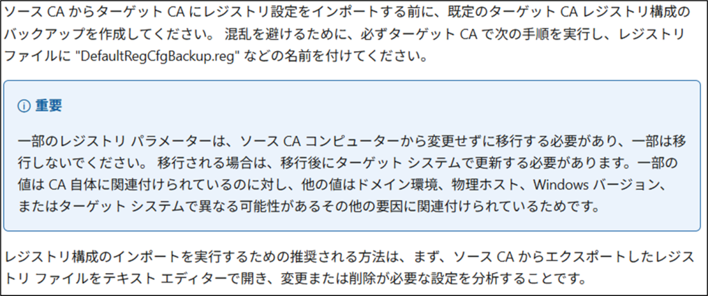上記ドキュメントの、「重要」では、要するに、旧CAサーバのレジストリを復元するけれども、設定値によっては新CAサーバの値が必要になるよ、と言っています。