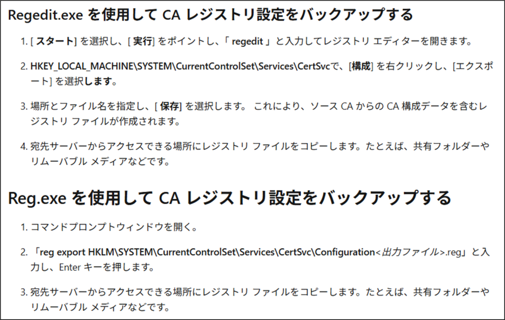 まず、記載のとおり、新CAサーバで旧CAサーバで実行したのと同じ手順で、レジストリのバックアップを取得しましょう。
