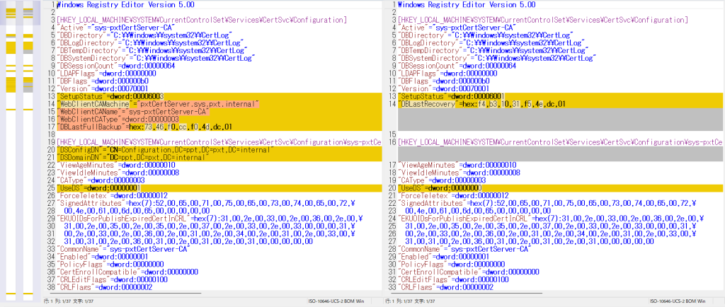青字の、WebClientCAMachine、WebClientCAName、WebClientCATypeは、旧CAサーバにのみ存在し、新CAサーバには存在しませんでした。この差分については害はないようです。これらは、