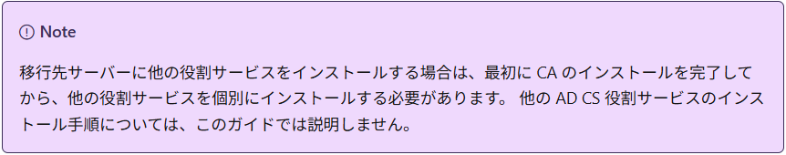 新CAサーバの機能インストールについては、ドキュメントの以下箇所で、CA移行に関しては最初に「証明機関」の役割を最初にインストールするように指示がありました。