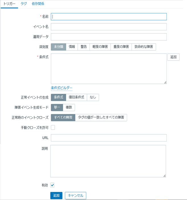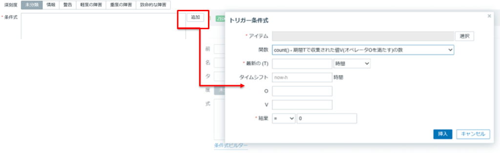 記載した通りアイテムの取得した内容からどのような条件時に障害とするのか判定をする式を設定いたします。