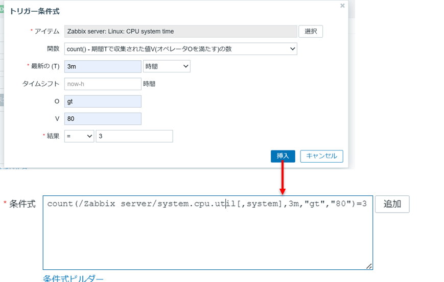 count(/HOST1/system.cpu.util[all,system,],3m, “gt”,”80″)=3
