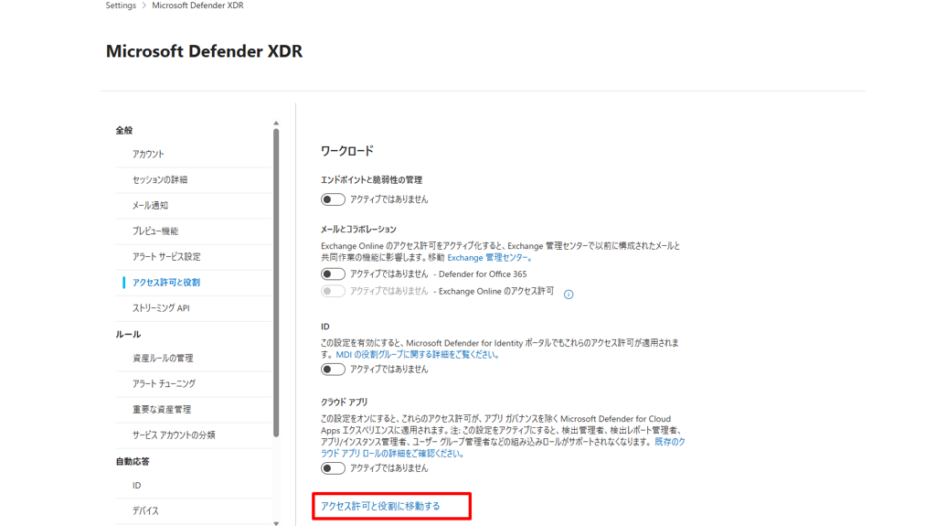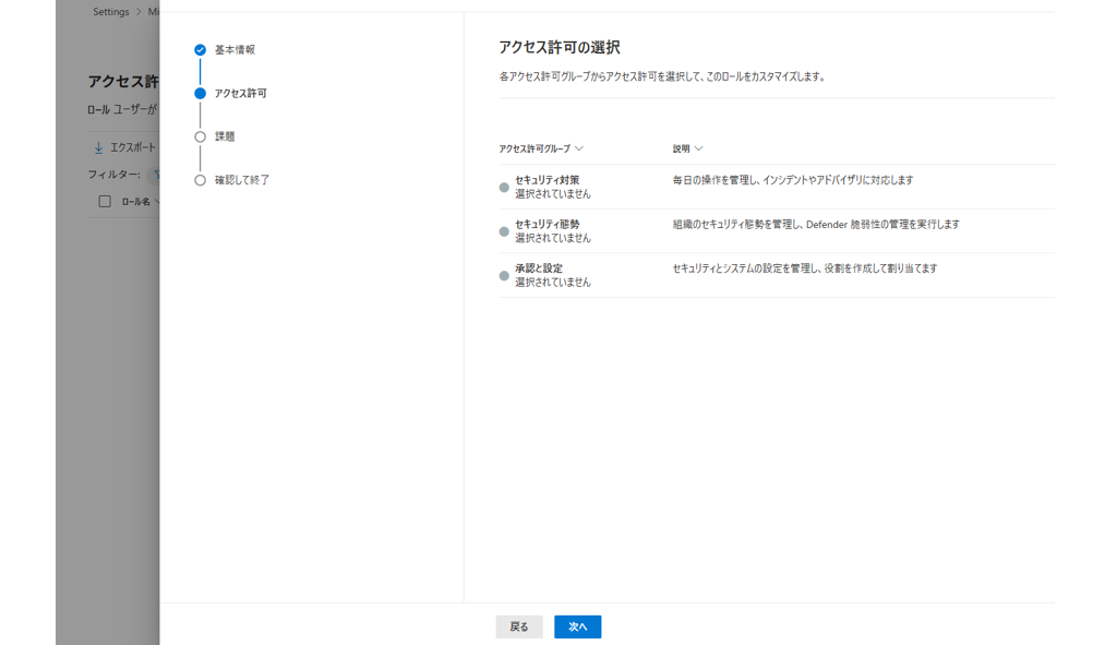 手順:Microsoft Defender > システム > 設定 > Microsoft Defender XDR > アクセス許可と役割 >アクセス許可と役割に移動する > カスタムロールを作成する